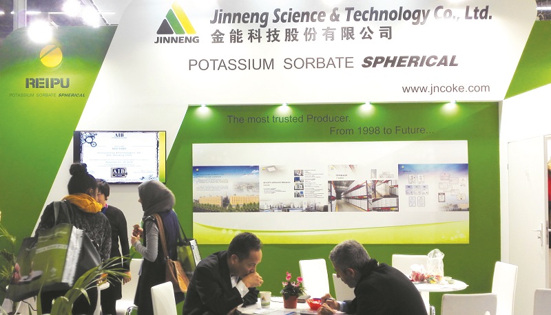 欧洲食品配料展会上,深含中国古典元素的公司布展吸引众多客户前来参观洽谈,好评如潮。(图为业务人