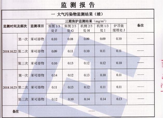 公司2018年10月20日-10月24日委托青岛衡立检测有限公司对公司厂界无组织与焦炉炉顶无组织进行现场取样检测,检测结果见下表: