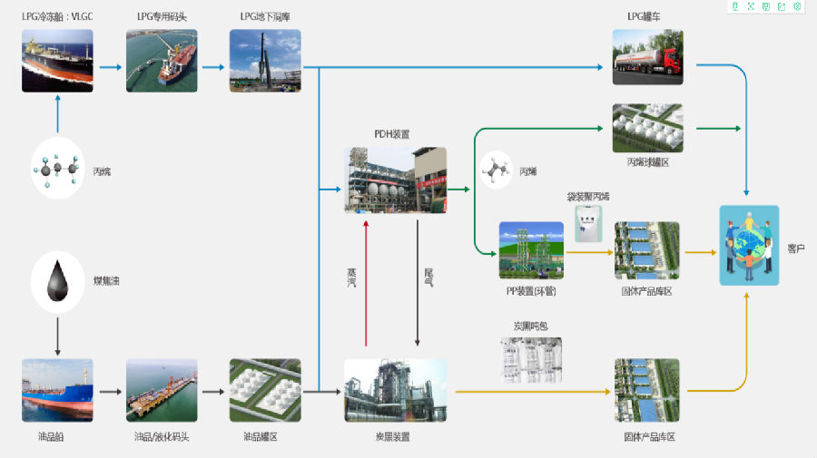 丙烷脱氢装置主要核心设备以进口为主,是目前世界首套单体最大的装置;PP装置一期采用Basell公司Spheripol工艺技术,单线产能45万吨,二期分别采用SpheriPol和Spherizone工艺技术,各建设一条45万吨/年的PP生产线,其中Spherizone技术工艺是Basell公司开发的最新一代聚丙烯生产工艺技术,采用气相循环技术,可生产保持韧性和加工性同时又具有高结晶度和刚性的更加均一的聚合物;青岛炭黑生产装置沿用公司自有技术,采用新型非夹套式五段炭黑反应炉,能够实现产品牌号全覆盖,仓储方面,配套建设立库项目,单个立库储量可达20000吨,这也是国内首次将立库引入炭黑项目的工程;公司拥有丙烷洞库,是目前国内第三家拥有丙烷洞库的企业,采用地下水封石洞储库储存丙烷技术,可存放近30万吨丙烷,具有运行安全可靠、成本和环境优势明显等特点。